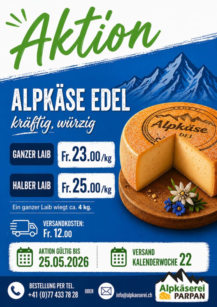 Weiterlesen: DIREKTVERKAUF & VERSANDSie finden unsere Produkte 7/24 in der Verkaufsvitrine vor Ort und auch in Wislers Holfaden im Dorfzentrum von Parpan. Falls Sie uns vermissen und zu weit weg sind, bieten wir auch Postversand an.