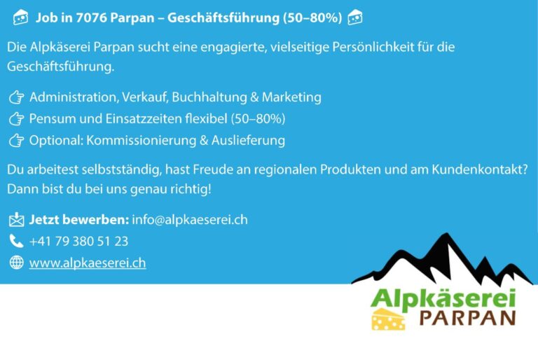 Wir suchen eine engagierte, vielseitige Persönlichkeit für die Geschäftsführung (50–80%) Ihr Aufgabengebiet Ihr Profil Wir bieten Interessiert?Wir freuen uns auf Ihre Bewerbung per Mail an: info@alpkaeserei.chTelefon: +41 79 380 51 23 / www.alpkaeserei.chArbeitsort ist 7076 Parpan. Administration kann im Homeoffice…